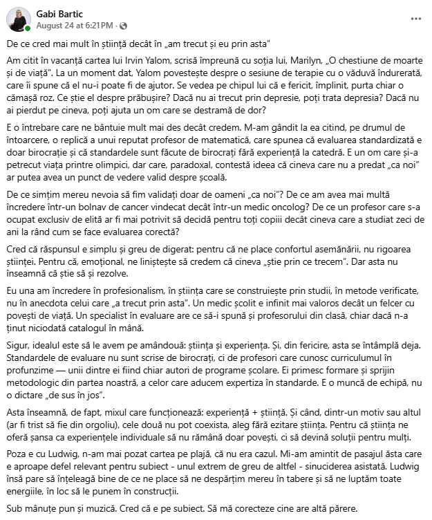 Totul a început de la postarea de pe Facebook (arhivată și în imaginea de mai jos) a doamnei Bartic, o recent postacă de profunzimi intelectuale nemărginite.